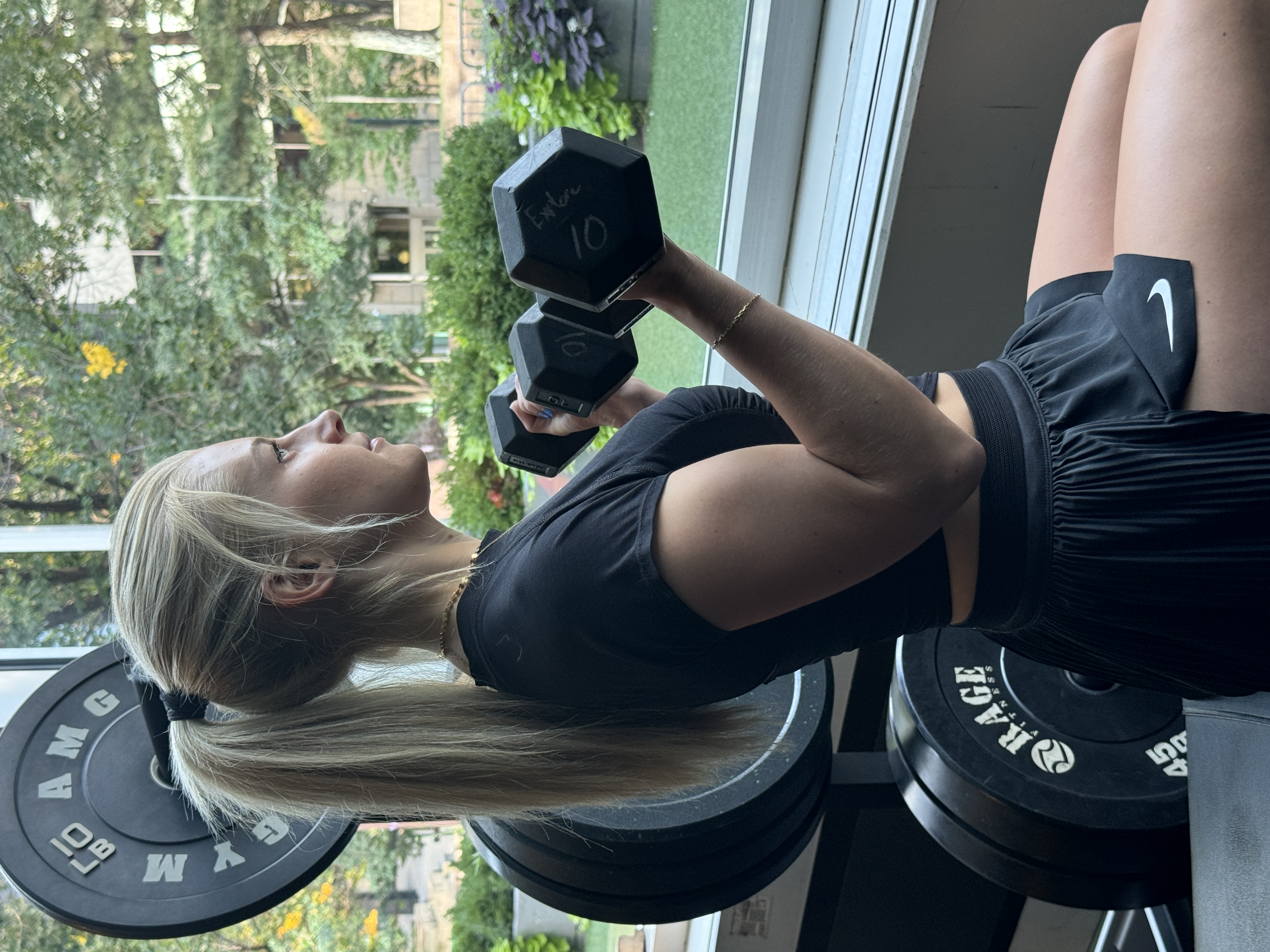 To start, I focused on helping her switch up her workouts through Personal Training. Because she builds muscle easily, she needed a strength training program designed to get her heart rate up and burn calories while also keeping her lean. This style of working out gave her new challenges to be excited about as well as an effective and efficient way to feel and look more toned and defined. Next, we met for Nutrition Coaching and talked through how she could structure her daily nutrition to prioritize stable blood sugar, athletic performance, and long-term health. Coming up with easy, convenient options she could adapt for home or travel allowed her to create consistency with her nutrition in a way that felt sustainable.